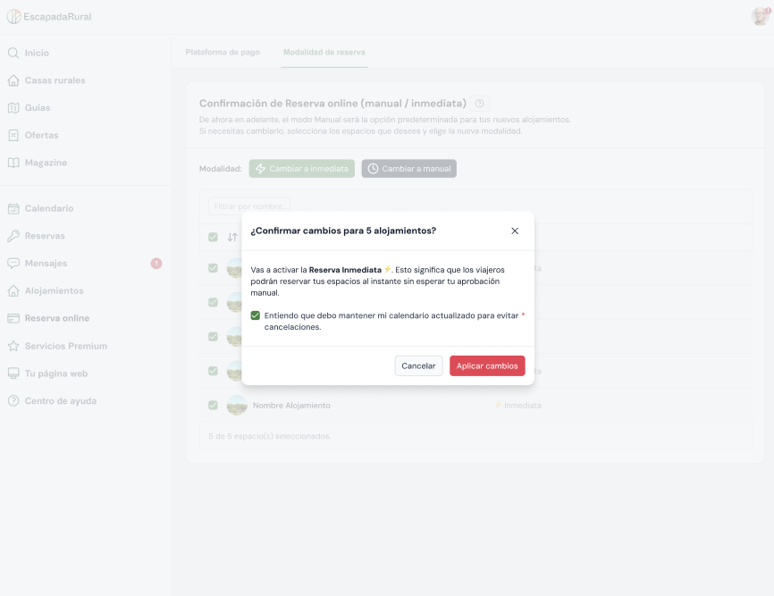 * La modalidad manual es la cual debes aceptar la reserva en las 24h desde la recepción de la misma.
